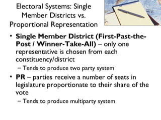 In a PR system the use of multimember districts allows more parties or smaller parties to gain seats. Single member district system. AP Gov Key Terms.